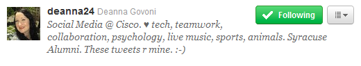 Attending this lecture was really a positive experience, and it turned out a lot better than I thought it would at first. Govani spent a lot of time talking about how Cisco is a good company to work for. While she was also giving career advice, the information about Cisco as a company did not tie into the overall theme of social media in the work place until much later in the lecture.